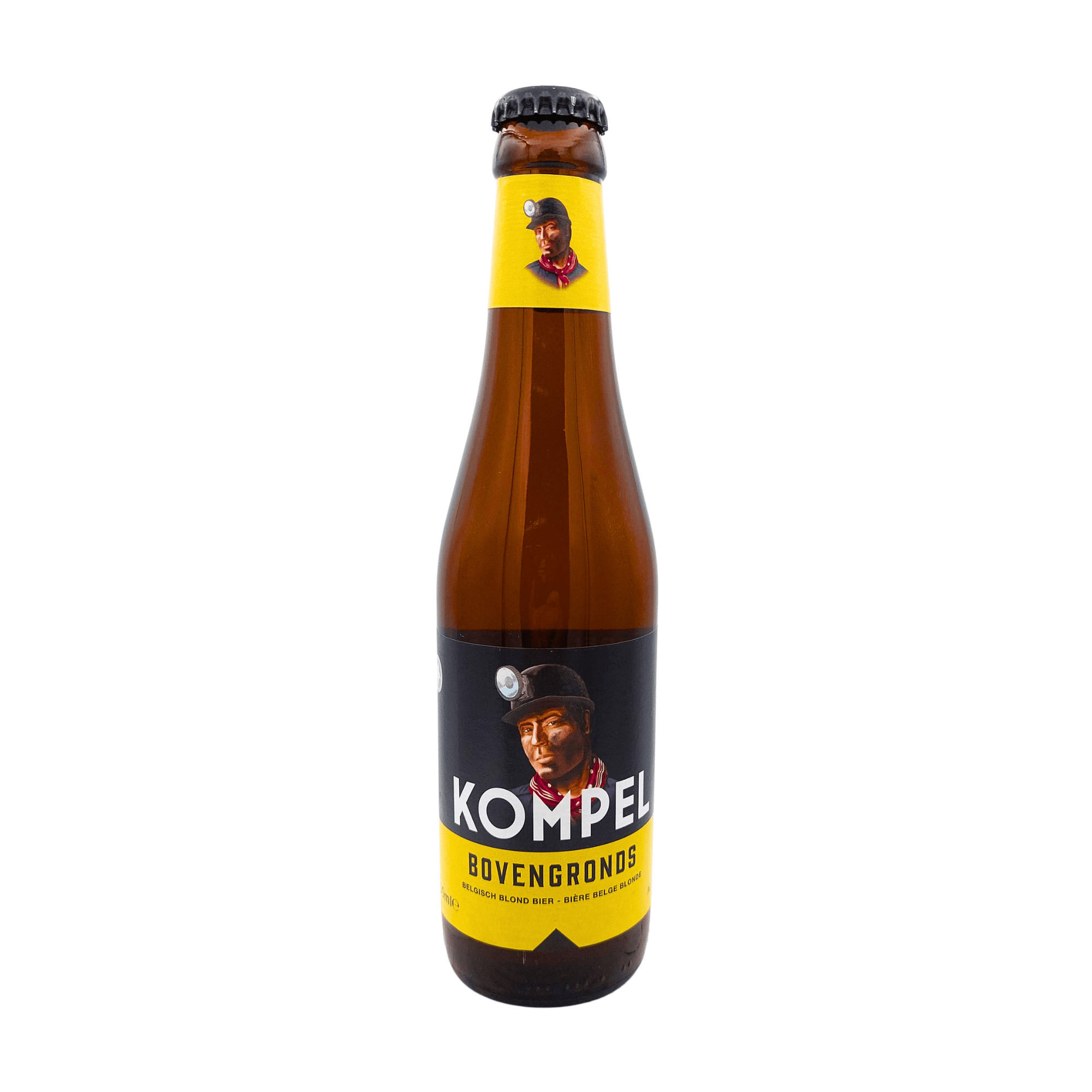 Kompel Bovengronds blond bierfles met zwart, wit en geel label