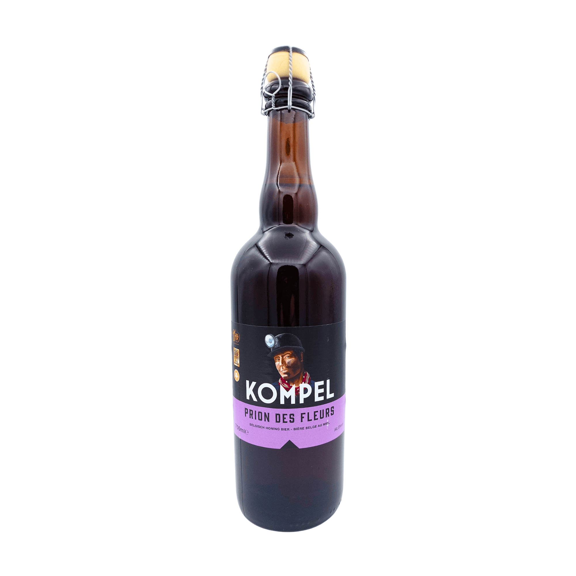 Een bijzonder goudblond honingbier met een verhaal: Kompel Prion des Fleurs werd gebrouwen ter ere van 30 jaar mijnsluiting in Eisden. Dit bier van hoge gisting, hergist op fles, krijgt zijn unieke karakter door heidehoning uit het Nationaal Park Hoge Kempen. Verwacht een elegante balans tussen honingzoet, frisse citrus en een subtiele kruidigheid.