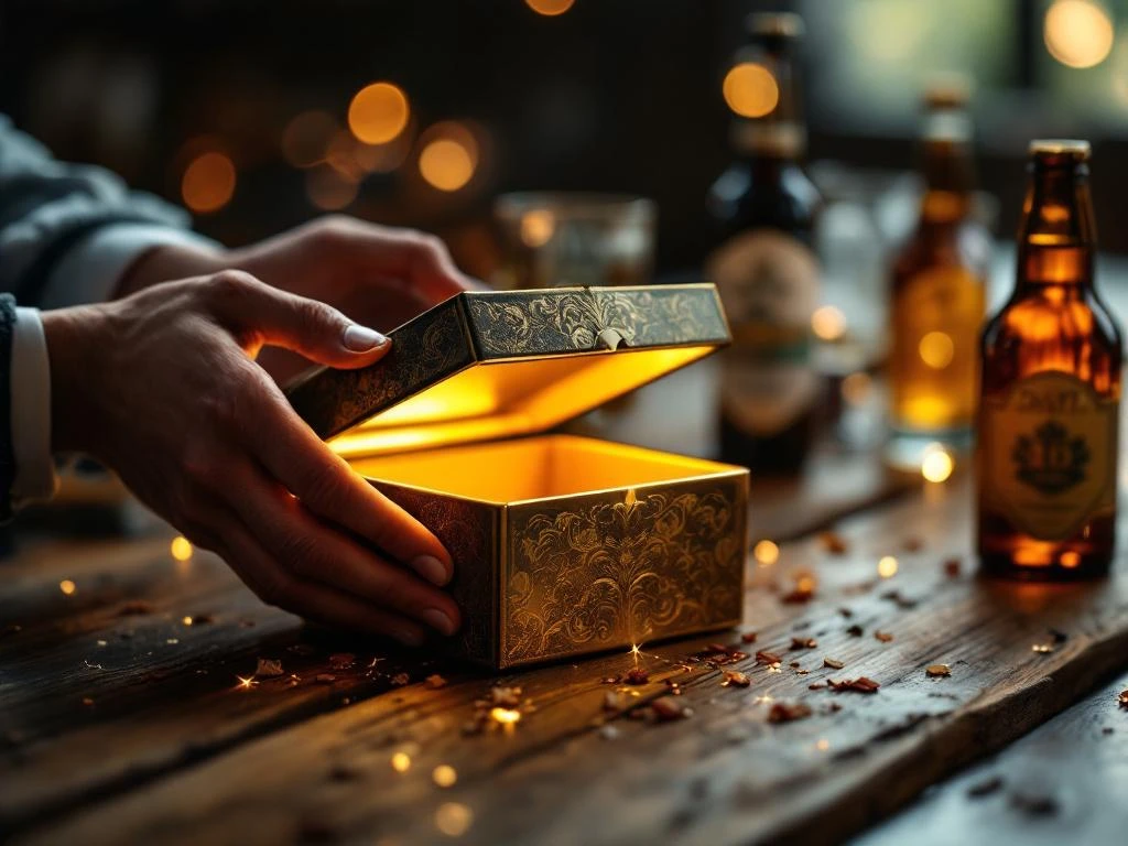 Elegante handen houden lege cadeaudoos met gouden interieur op houten tafel omringd door ambachtelijke bierflesjes